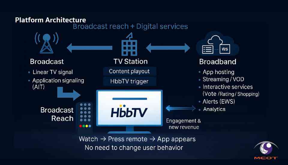 เทคโนโลยี HbbTV คือการผสานระบบ Broadcast แบบเดิมของทีวีดิจิทัล (DVB-T2) เข้ากับระบบ Broadband หรืออินเทอร์เน็ตความเร็วสูง ทำให้ทีวีธรรมดาไม่ใช่แค่จอรับภาพอีกต่อไป แต่กลายเป็นแพลตฟอร์มที่ตอบสนองผู้ชมได้หลากหลายกว่าเดิม เช่น